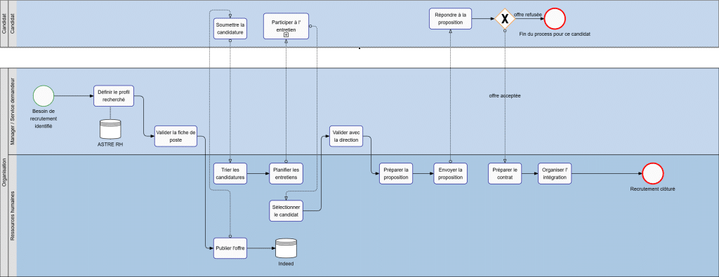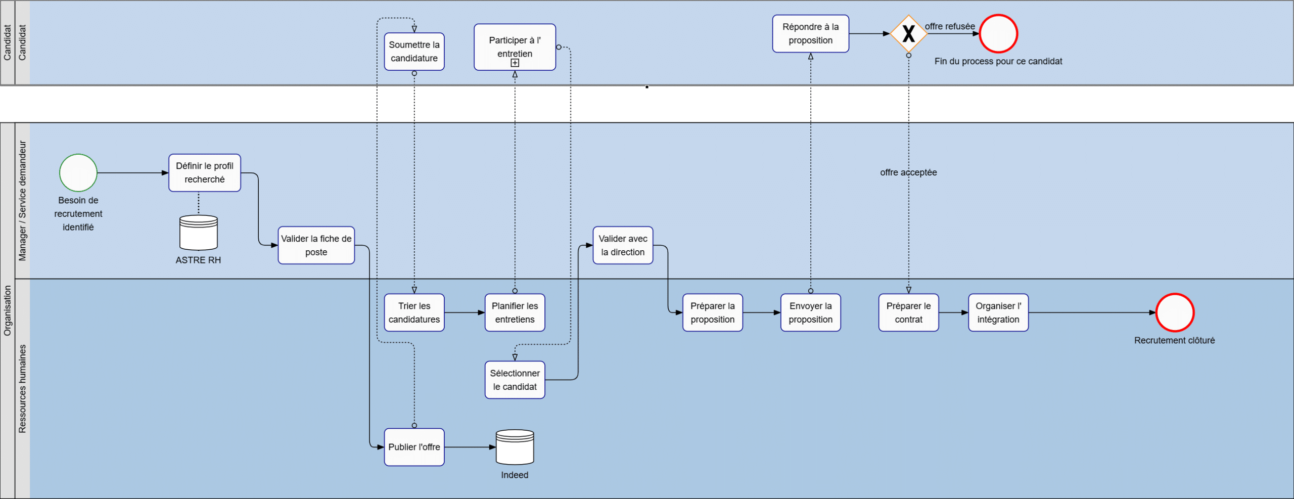 Exemple de cartographie BPMN du processus de recrutement, illustrant les interactions entre services et outils RH.